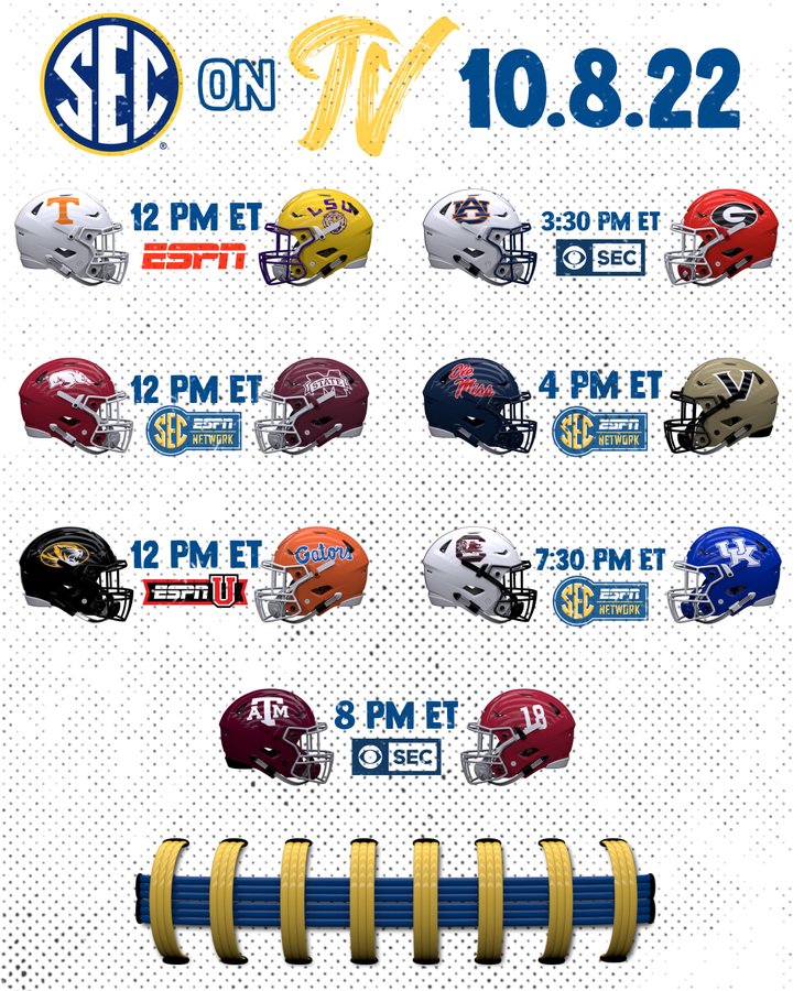 Two of the best in the SEC West receive the prime-time slot on ESPN while a slew of rivalry games will be featured throughout the afternoon setting up a thrilling schedule for Week 6 in. SEC week 6 TV schedule Posted by David Ricky on 92616 at 1208 pm. Full schedule for the 2022 season including full list of matchups dates and time TV and ticket information.